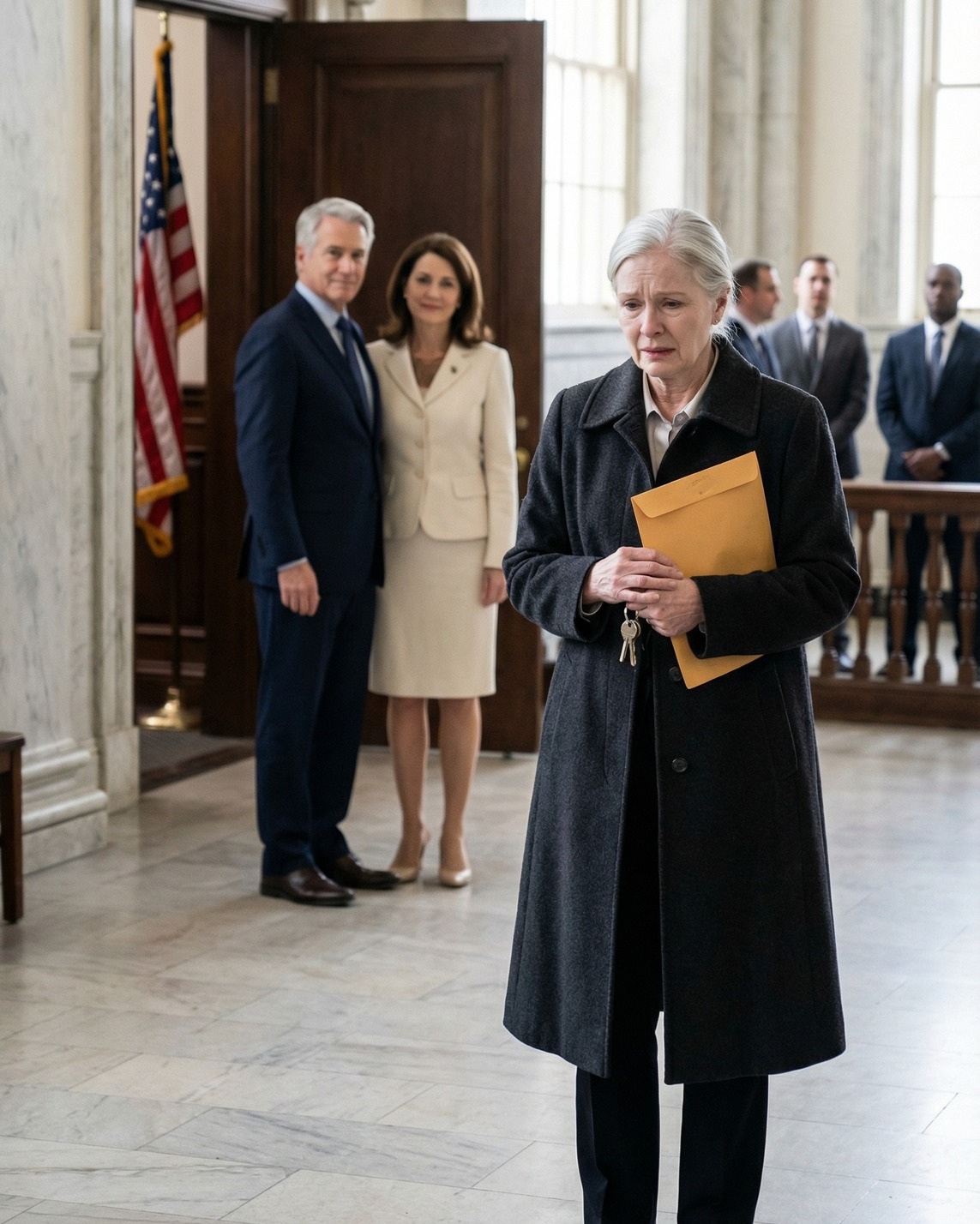 A bírósági szolga tétovázva közelebb lépett. Renee ülve maradt, kezei láthatóak, arckifejezése megfejthetetlen. Nyugalma jobban felkavarta a termet, mint amennyire a harag tette volna.