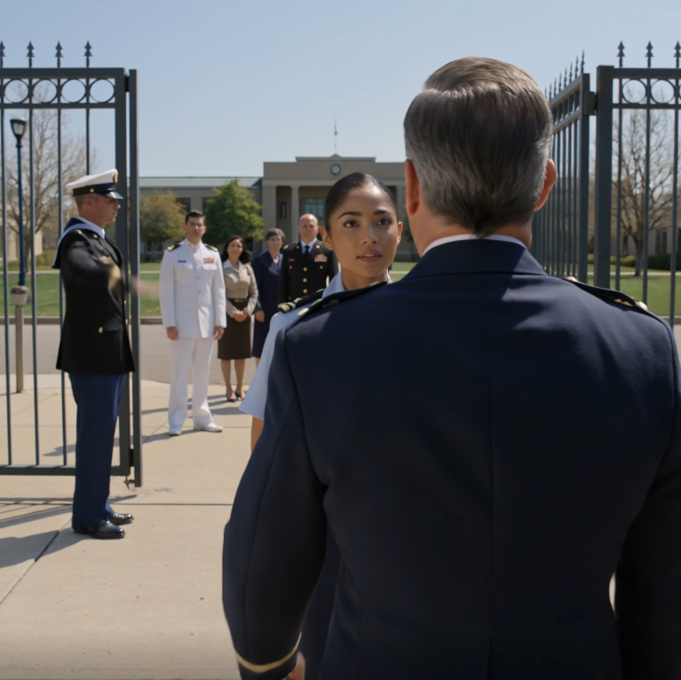 A zihálások úgy hullámoztak, mint a felettünk lobogó zászlók. Megfordultam, és láttam, hogy a beszélő kilép a tisztek sorai közül: Julia Reeve parancsnok. Nem volt a műsorban. Nem kellett volna itt lennie, de mégis ott volt. És azzal a nyugodt tüzével sétált, aki túl sokáig várt arra, hogy csendben maradjon. Az egyenruhája makulátlan volt. Jelvényei csillogtak a novemberi nap alatt. Előrelépett, csizmái teljes tekintéllyel csapódtak a földhöz, majd megállt mellettem. Szemtől szemben álltunk. Nem mosolygott, nem bólintott – csak határozottan nyugtázta. „Elég sokáig vártunk” – mondta. „Itt az idő.”